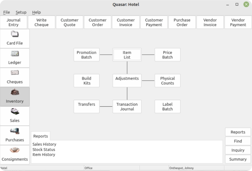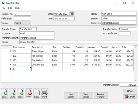 Those businesses with multiple locations will be interested in the Quasar stock transfer feature. Create your "transfer out" in one location and the "transfer in" in the second location. The security controlled "Transfer in" must be received by the receiving store. Update of inventory quantities for the sending store at time of sending. Update of inventories at time of receiving in the receiv- ing store. In-transit inventories tracked for audit purposes. All ledgers updated