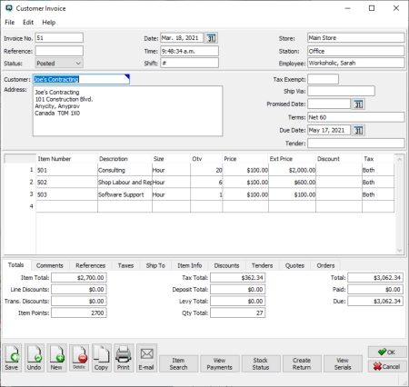 A sales invoice can be generated from a customer quote, a sales order, a point-of-sale terminal, imported into Quasar from your WooCommerce web store or created manually. A copy of the invoice can be emailed directly to the customer using Quasar's email function. Invoices may be paid immediately with single or multi- ple tenders. Approved customers can charge to a re- ceivable account. Automatically applies applicable customer discounts and special pricing. Automatically applies applicable taxes by product and customer. Alerts the sales staff if loyalty discounts are available.