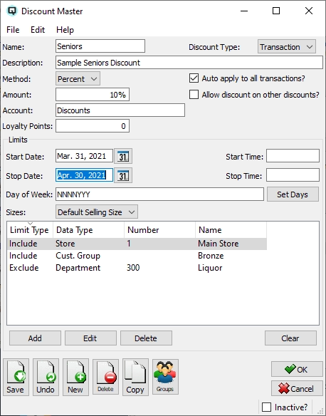 Discounts provide a full audit trail. Always know who is giv- ing what discount and to who. Discounts can be either line item or transaction discounts. Create either percentage off or dollar discounts. Set the start date, end date, start time, end time and valid days of the week that the discount is valid. Include or exclude stores, store groups, customers, cus- tomer groups, items, item groups, departments or sub- departments. Have the discounts auto apply or have the sales per- sonal add them manually.
