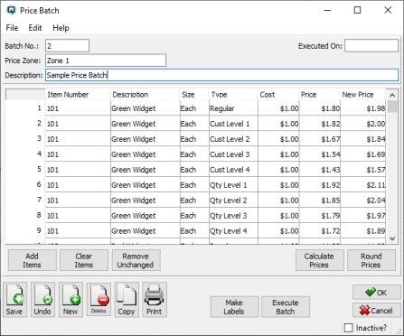 While you can change prices by item the price batch tool allows you to change the price on large quantities of items all at once. You will have the ability to add an entire department sub-department or item group to your price batch. Choose to calculate prices to maintain a percentage markup or margin. Alternatively, choose a general per- centage increase/decrease or, if you prefer, use the target margins you have set for each of the items to establish your new prices. Use rounding rules to round your price points. In addition to the regular price you can set up to four pricing levels and four quantity levels..