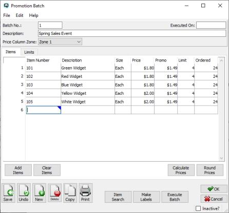 Create and execute promotional batches which can con- tain large quantities of promotion priced items. Promotion batches are set by price zone Set the start date, end date, start time, end time and valid days of the week that the promotion pricing will be available to your customers. Include or exclude stores, store groups, customers or customer groups. As an example, you may decide to have a promotion just for a special group of customers or you may elect to not give the promotional price to certain customers. Generate price labels for all of your promotional items.