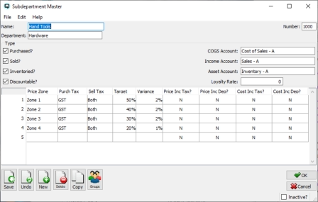 Very strong inventory control features including synchro- nizing your products, pricing and onhands with your WooCommerce online store. Departments are the highest level of inventory. Sub-departments are nestled within de- partments and items are nestled within sub-departments. This hierarchy provides an excellent tool for finding, report- ing and listing items. The following default information de- fined in the sub-department makes creating new items much quicker: Define if the items will be purchased, sold and inventoried. Define the ledger account information for the items Define the taxes associated with the item and whether those taxes are included in the selling price of the items. Define the target margin of the items. Defaults can be overwritten at the item level..