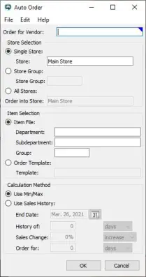 Generate purchase orders manually or use Quasar's auto order feature. Use the auto order feature to generate orders based on current stock, sales trends and sales history. Use the auto order feature to generate orders based on on hand quantities and min/max quantities. Populate an order manually, with the auto order feature or using an order template. Create order templates in the same item sequence as used by your vendor in their shipping documents. That will significantly speed up your receiving process as you compare the order to the receiving. Update costs and generate price changes from the order. Generate the receiving vendor invoice from the order.