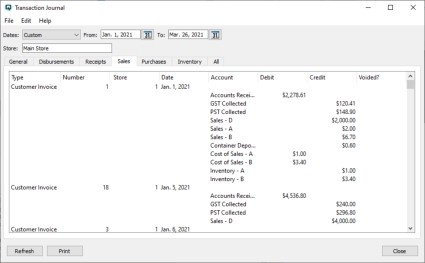 While not unique to Quasar journal entries may be added using a journal entry screen. All transactions such as customer invoices, customer payments, customer returns, vendor purchases and vendor claims automatically generate journal entries. The journal entries for each transaction can be viewed in the transaction journal screen. Transaction journals can be viewed for all entries, for manual journal entries, for disbursements, for receipts, for sales and for purchases between defined dates and for a defined store (business location).