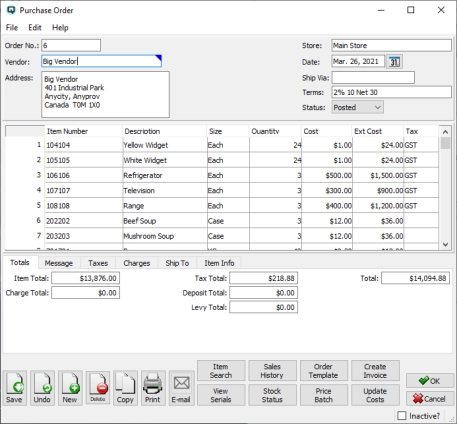 Quasar tracks container deposits and environmental levies separate from the item costs. Quasar can break out deposits embedded in the cost of the item and include them, when necessary, in the selling price of the item. Quasar provides account ledger control on deposits and levies.