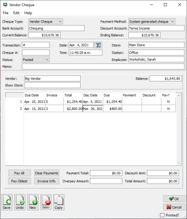 When you make a vendor payment Quasar uses the ven- dor terms to automatically take vendor payment dis- counts. If you are late with your payments you still have the option to take the terms discount anyway. You can pay a single vendor using the vendor payment screen. Select "Pay All" to pay all invoices, select just the in- voices to pay or allocate your payment to the oldest invoices. If you desire to pay all bills that are due from all ven- dors there is pay bills screen available for that.. Bills can be paid with hand written cheques. By using a system generated cheque or by recording debit/credit online payments.