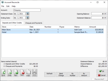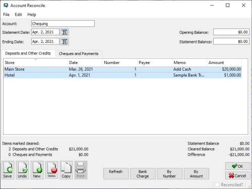 Quasar's account reconciliation screen reconciles your banking data with a bank statement. Simply enter the bank statement date and the ending date for transactions to appear as part of the reconciliation. Bank charges can be entered as required from the rec- oncile screen. Report on cheques or payments not cleared by the bank.