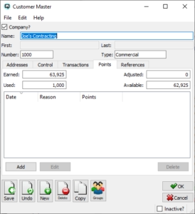 Assign points to customers based on their purchases. Customers then can receive discounts based on those ac- cumulated points. Special discounts are defined to redeem customer points. While default points are set by sub-department, points can be defined by item, hence higher profit items can be set to generate more points. Customer points are displayed on receipts. Cashiers are notified when a customer has earned enough points to receive a points discount.